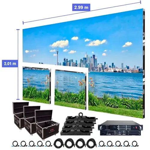 La pantalla LED Video Wall de aproximadamente 2.99 metros de ancho por 2.01 metros de alto (equivalente a 9.8′ × 6.6′) con paso de píxeles 3.91 mm (P3.91) es una solución interior “turn-key”, ideal para auditorios, iglesias, salas corporativas, eventos, señalización digital, retail o salas de reuniones. El sistema incluye 24 paneles modulares, procesador de video, cablería, estructura de montaje, y está listo para instalar.