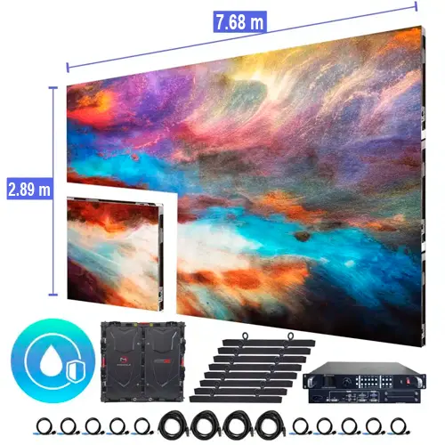 Pantalla LED exterior/interior de 7.68 m × 2.89 m (P5 mm), 24 paneles, alta luminosidad (~5200 nits), frecuencia 3840 Hz, protección IP65 y solución turnkey lista para instalar — ideal para publicidad, eventos, conciertos, fachadas, señalización urbana y pantallas de gran formato.